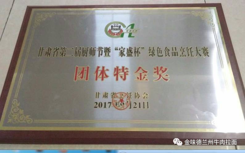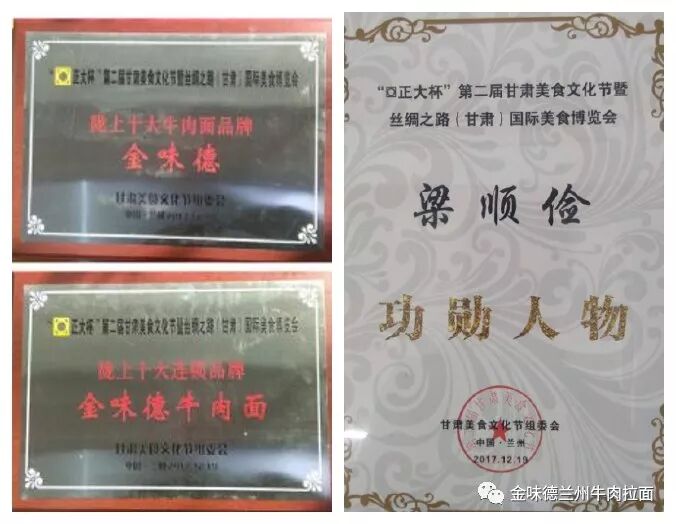 “正大杯”第二屆甘肅美食文化節(jié)暨絲綢之路(甘肅)國際美食博覽會上,金味蘭州牛肉拉面斬獲隴上十大牛肉拉面品牌、隴上十大連鎖品牌兩項(xiàng)大獎,金味德集團(tuán)董事長梁順儉被授予“甘肅餐飲業(yè)十大功勛人物”榮譽(yù)稱號。